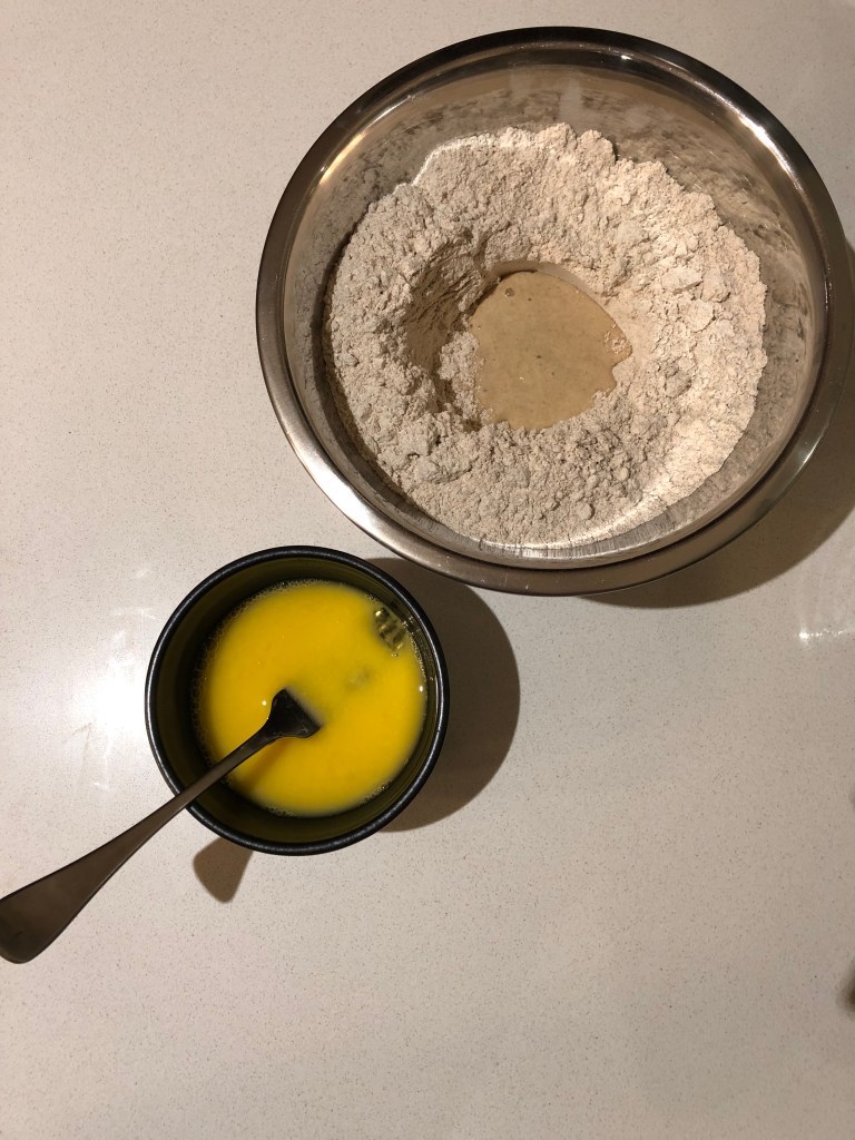 1. Weigh out your flours in a medium sized bowl and push up to the sides so that a well forms in the middle.